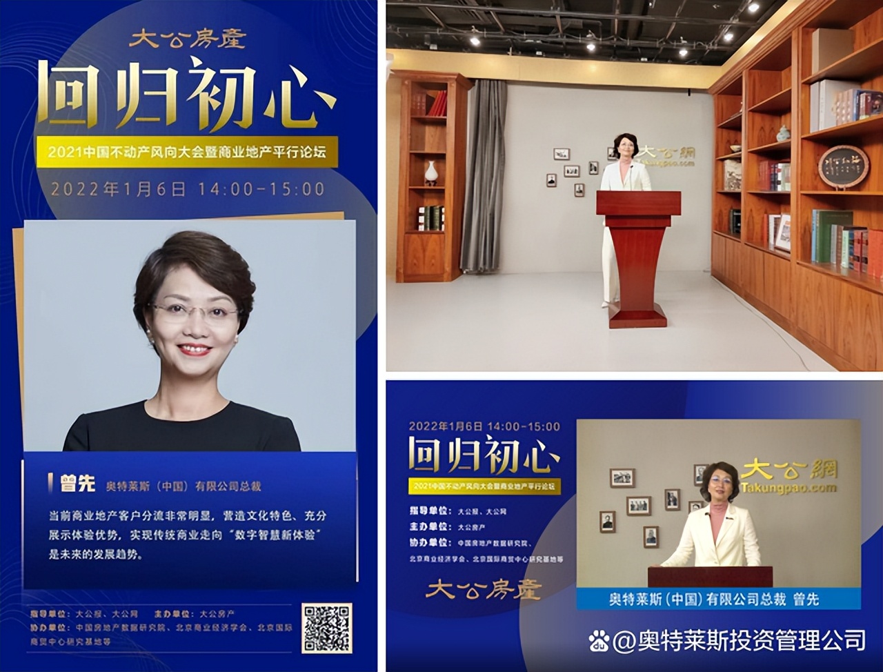 1月6日,由大公網(wǎng)房產(chǎn)頻道聯(lián)合多方機(jī)構(gòu)舉辦的“【回歸初心】——2021中國不動(dòng)產(chǎn)風(fēng)向大會暨商業(yè)地產(chǎn)平行論壇”線上直播活動(dòng)正式開始。奧特萊斯(中國)有限公司總裁受邀參加本次活動(dòng),并進(jìn)行了精彩的線上直播發(fā)言。