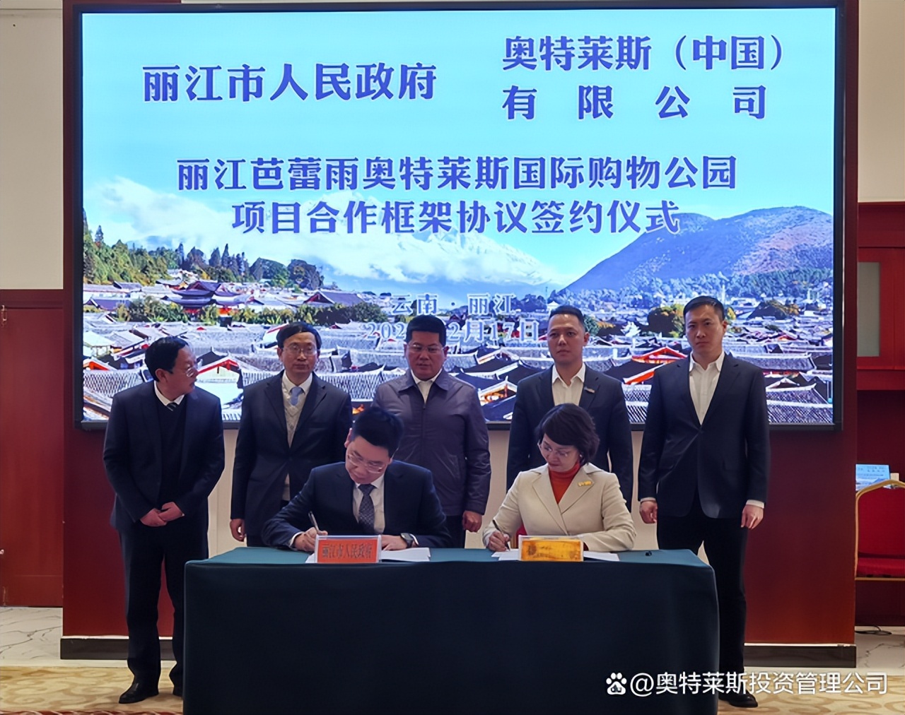 2月17日,奧特萊斯(中國)有限公司總裁拜訪麗江市政府,與麗江市蘇永忠市長在麗江座談,并見證《麗江芭蕾雨奧特萊斯國際購物公園項(xiàng)目合作框架協(xié)議》的簽署。奧特萊斯(中國)助理總裁李曉薩、投資拓展中心總經(jīng)理周毅,以及麗江市政府、市發(fā)改委、市投資促進(jìn)局、市住房和建設(shè)局、市文旅局、玉龍雪山管委會、玉龍縣政府等主要領(lǐng)導(dǎo)參會。