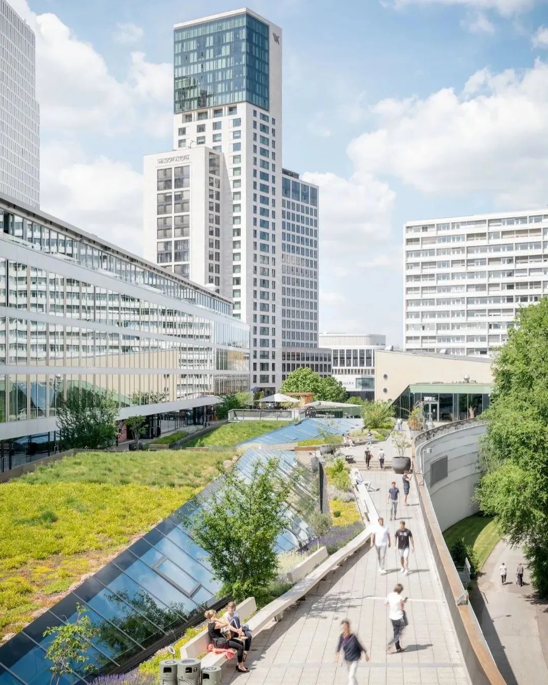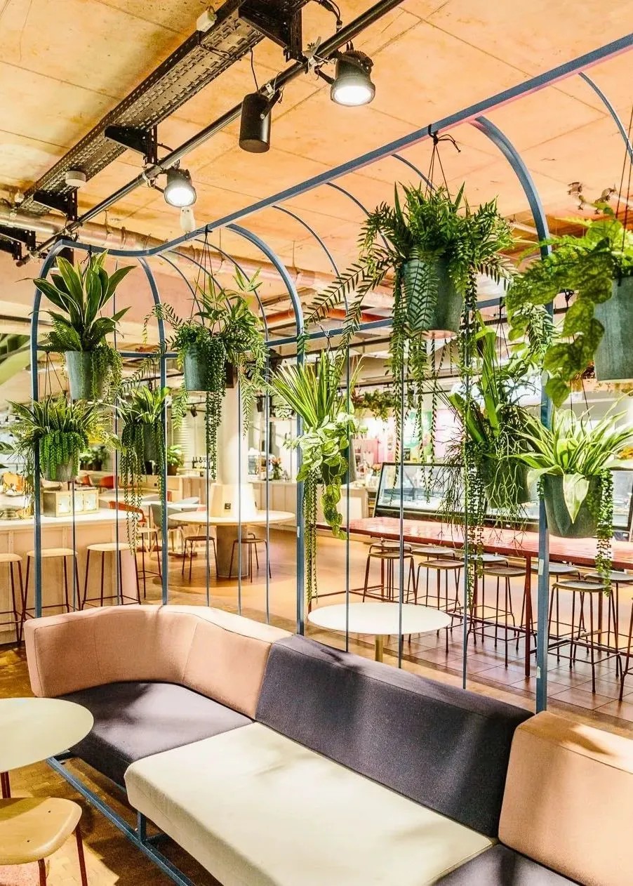 在商業(yè)的二層則設(shè)置了一個(gè)開放、通透的公共空間,同柏林潮流酒店25小時(shí)(Twenty five hours hotel)進(jìn)行聯(lián)通。并以城市綠洲為設(shè)計(jì)概念,在頂層設(shè)計(jì)了一個(gè)布滿植物盆栽的七千平方公尺的天臺(tái),供給顧客休憩社交,營(yíng)造自由、無拘束的商業(yè)氛圍,與項(xiàng)目的整體定位相得益彰。