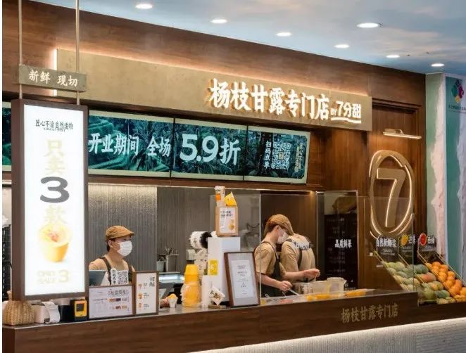 去年,七分甜的首家楊枝甘露專門(mén)店在上海長(zhǎng)寧龍之夢(mèng)開(kāi)業(yè),在產(chǎn)品方面,專門(mén)店僅售三款產(chǎn)品,分別是1987經(jīng)典楊枝甘露、2007鮮芒楊枝甘露、楊枝甘露Gelato,分為碗裝、杯裝和冰淇淋,定價(jià)在15-20元。在店型方面,走小店模式,不設(shè)堂食。專門(mén)店面積大約只有20平方米左右,目前僅支持下單后排隊(duì)自取。在裝修風(fēng)格上,店內(nèi)裝修以原木配色為主,主打簡(jiǎn)約風(fēng)。在鮮果陳列區(qū)擺放了制作楊枝甘露所需要的椰子、芒果、西柚等原料,采用明檔吧臺(tái)在顧客面前現(xiàn)切現(xiàn)做,讓消費(fèi)者直觀感受產(chǎn)品的制作流程。